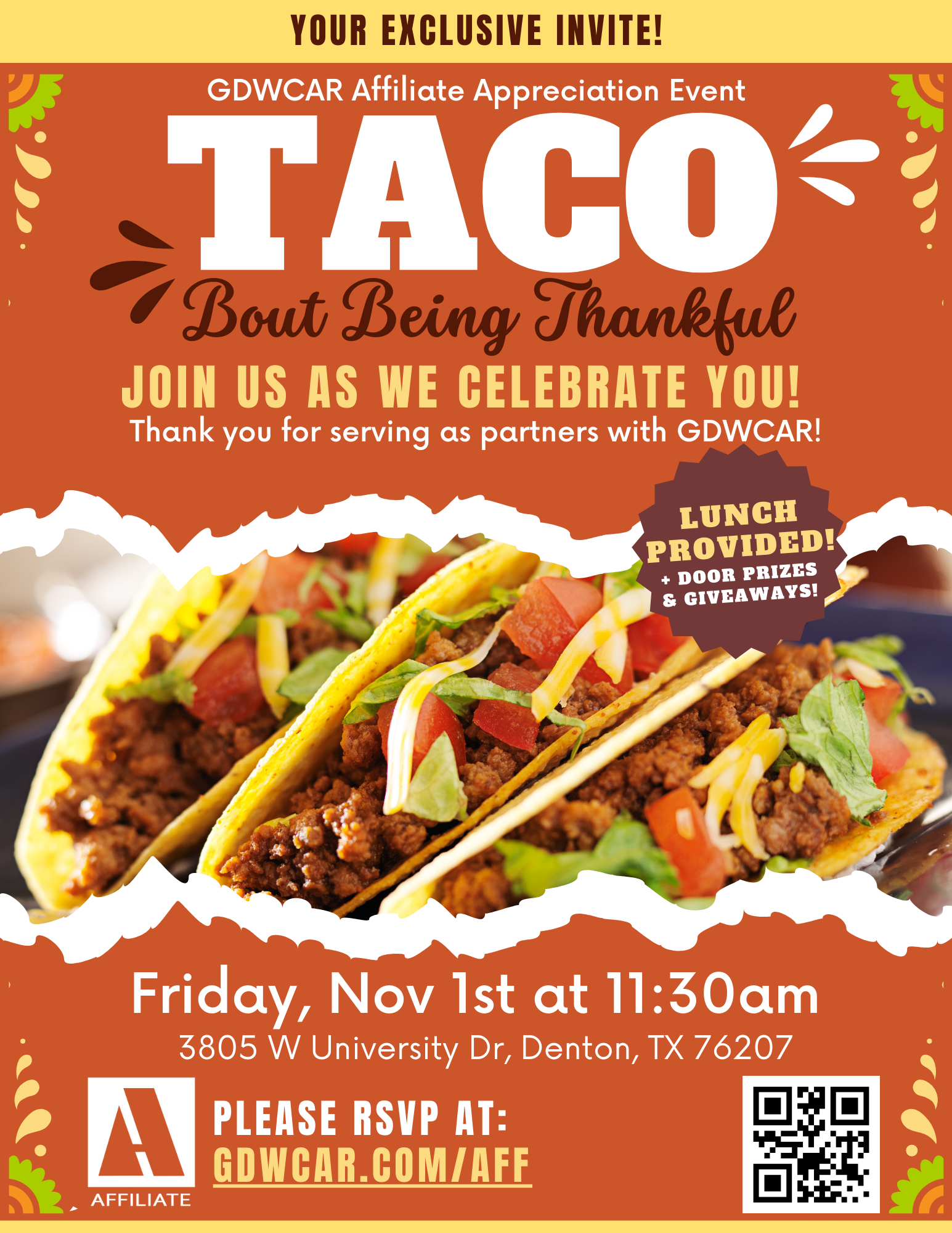 Affiliate Members: Taco Bout Being Thankful lunch! We are excited to celebrate you! We will see you on Friday, November 1st at 11:30am at the GDWCAR Office. Thank you for serving as partners with GDWCAR!