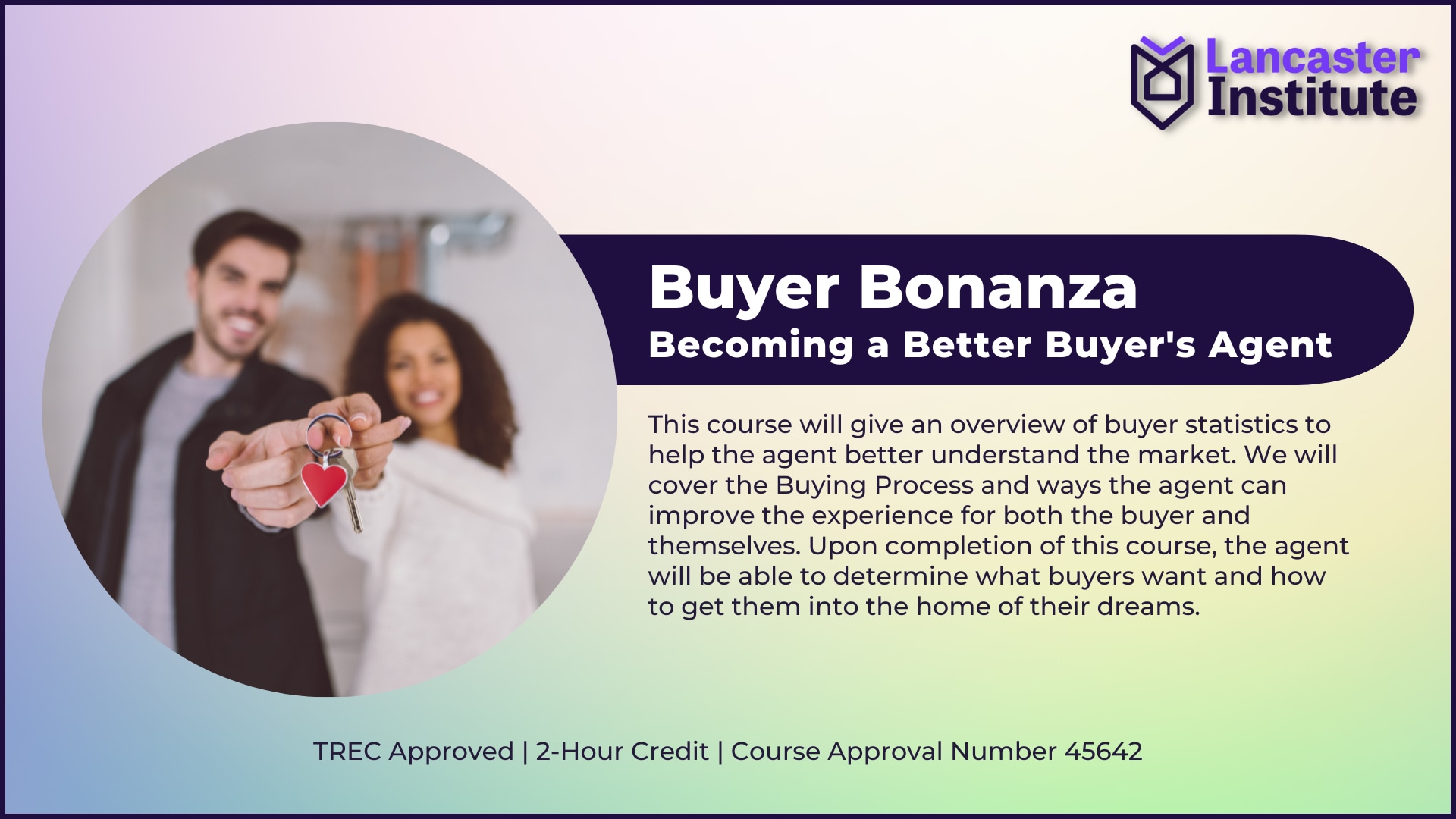 This course will give an overview of buyer statistics to help the agent better understand the market. We will cover the Buying Process and ways the agent can improve the experience for both the buyer and themselves. Upon completion of this course, the agent will be able to determine what buyers want and how to get them into the home of their dreams.