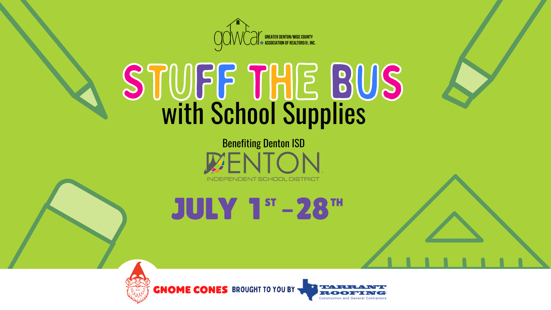 We'll be having a fun-filled drop off day here at the office on July 28th where you can get a FREE Gnome Cone treat (brought to you by Tarrant Roofing) with a donation of school supplies!