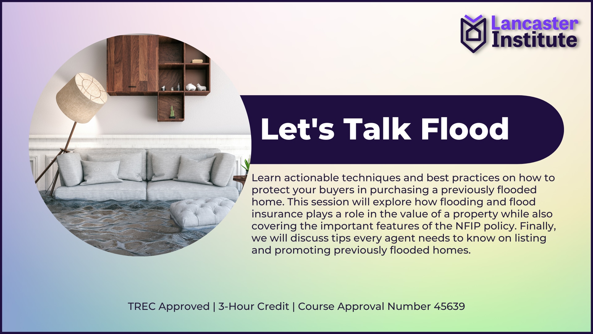In this course, the student will gain actionable techniques and best practices on how to protect their buyers in purchasing a previously flooded home; as well as, listing and promoting previously flooded homes. This session will explore how flooding and flood insurance plays a role in the value of a property. Additionally, we will discuss the important features of the NFIP policy every agent needs to know.