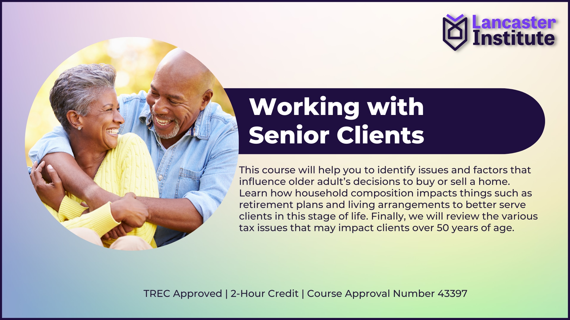 This course will help you to identify issues and factors that influence older adult’s decisions to buy or sell a home. Learn how household composition impacts things such as retirement plans and living arrangements to better serve clients in this stage of life. Finally, we will review the various tax issues that may impact clients over 50 years of age.